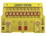 The Master Lock 10-pack lockout station with cover is a yellow polycarbonate wall-mounted lockout/tagout supply center with a lockable translucent acrylic cover, and includes 2 lockout hasps, 24 laminated safety tags, and 10 Zenex thermoplastic safety padlocks with 6-pin tumbler cylinders. The polycarbonate body is impact and corrosion resistant, and has 4 holes for mounting on a wall (mounting bracket and tools sold separately). The acrylic cover displays contents, helps keep out dust and dirt, and has a hinge that holds it open during use. Under the cover are 10 clips for hanging safety padlocks, 4 clips for hanging lockout hasps, and 2 bins for safety tags. This station is part of a lockout/tagout (LOTO) safety procedure required at facilities where devices and energy sources need multiple-person authorization to be accessed safely during maintenance and repair. The lockout station helps provide organized and convenient access to the necessary type and amount of lockout devices for each energy source requiring lockout.